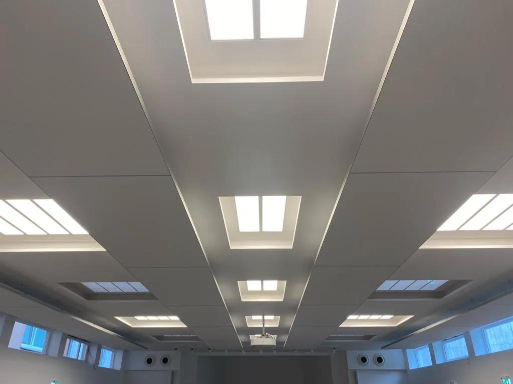 Zum Einsatz kamen speziell entwickelte Deckensabsorber von acoustictex. Bei einer Belegungsfläche von etwa 30 % reduzierten diese gezielt die Nachhallzeit – und zwar auf beeindruckende 0,65 Sekunden. Damit wurde aus einem akustisch schwierigen Raum ein voll nutzbarer Veranstaltungsort mit hervorragender Sprachverständlichkeit.