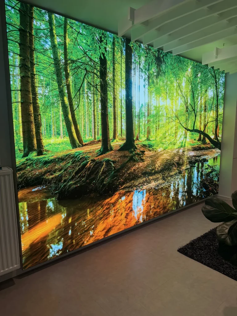 Wer unsere Ausstellung in Wunstorf betritt, bleibt meistens erstmal stehen. Nicht, weil man muss, sondern weil man will. Denn was hier an der Wand hängt, ist kein gewöhnliches Bild. Es ist ein echter Blickfang: Ein großformatiges, hinterleuchtetes Akustikbild mit Waldmotiv, das den Raum nicht nur visuell, sondern auch akustisch verändert.