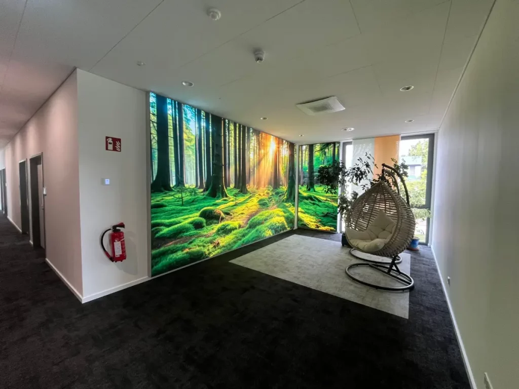 Für den Wartebereich (siehe Bilder) wählten die Planer ein tiefes, beruhigendes Waldmotiv. Das beleuchtete Akustikbild fängt die Sonne ein, die durch die Baumwipfel bricht, und taucht den Raum in ein warmes, grünes Licht. Es ist, als würde man ein Stück Natur nach drinnen holen. Diese visuelle Ruhe wird durch die akustische Wirkung des Bildes ergänzt: Der dicke Schallschluck-Kern reduziert den Nachhall deutlich und schafft eine Atmosphäre, in der man sich gerne aufhält. Die leuchtenden, moosgrünen Töne (gut zu sehen im Detailbild) wirken entspannend und erden den gesamten Bereich.